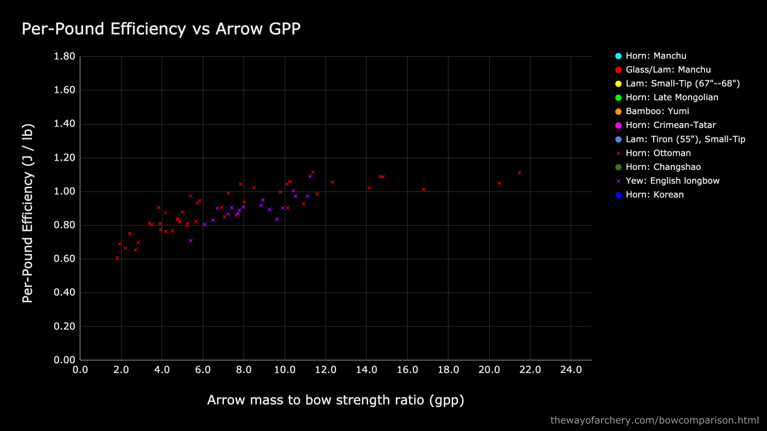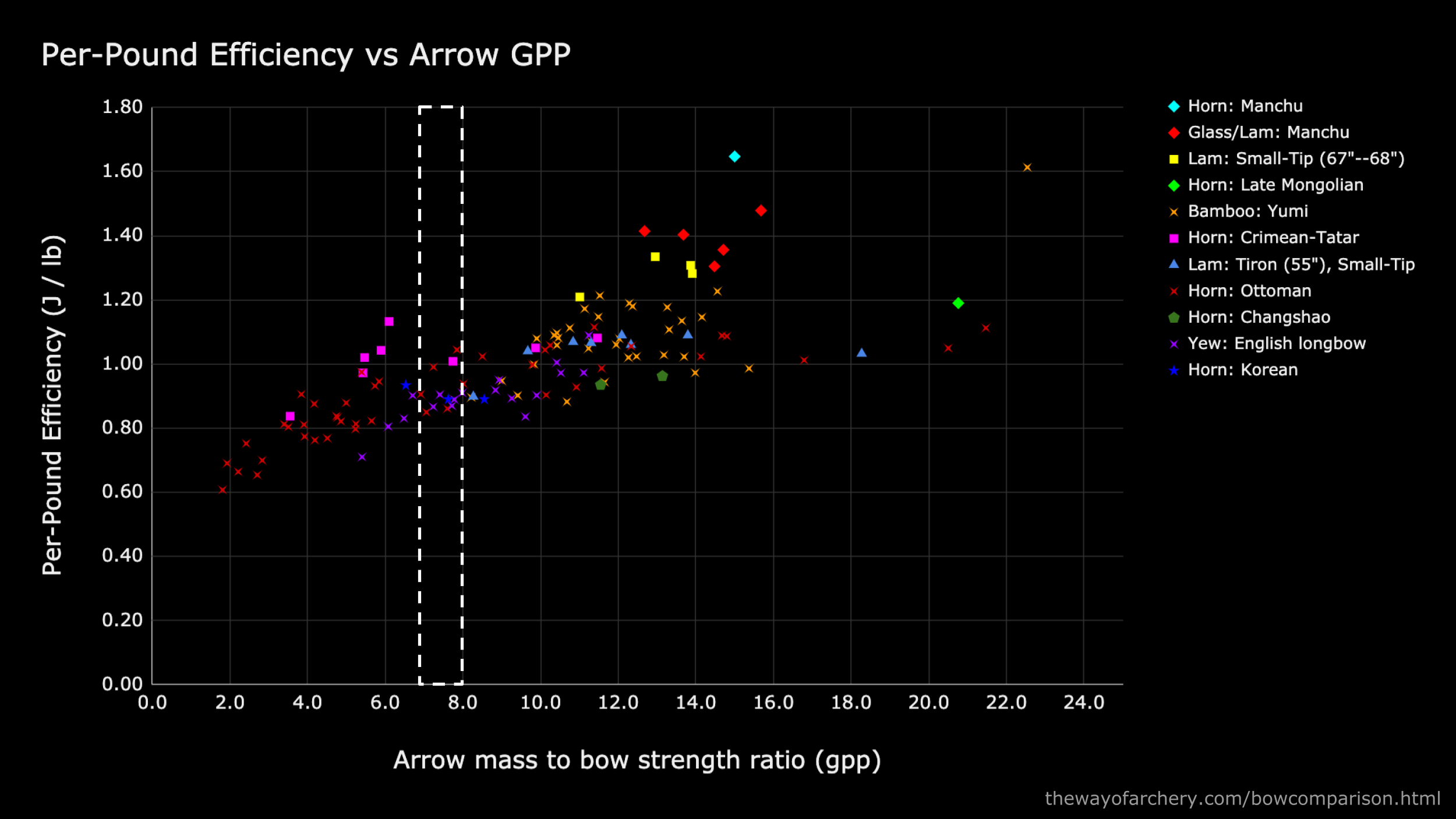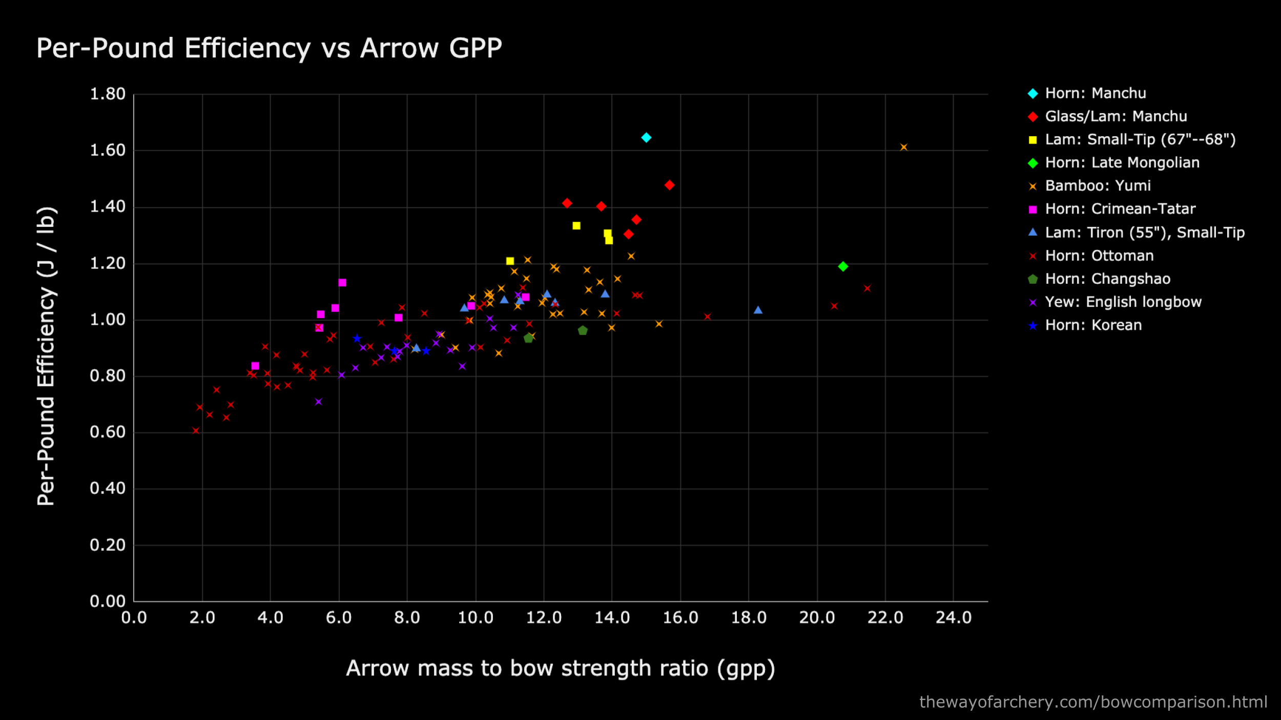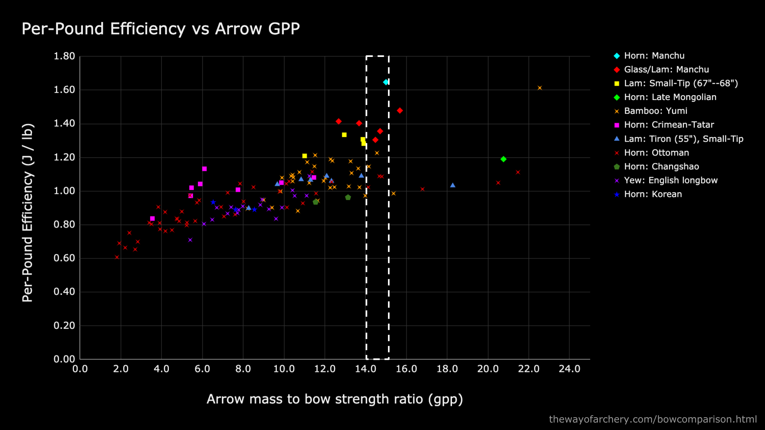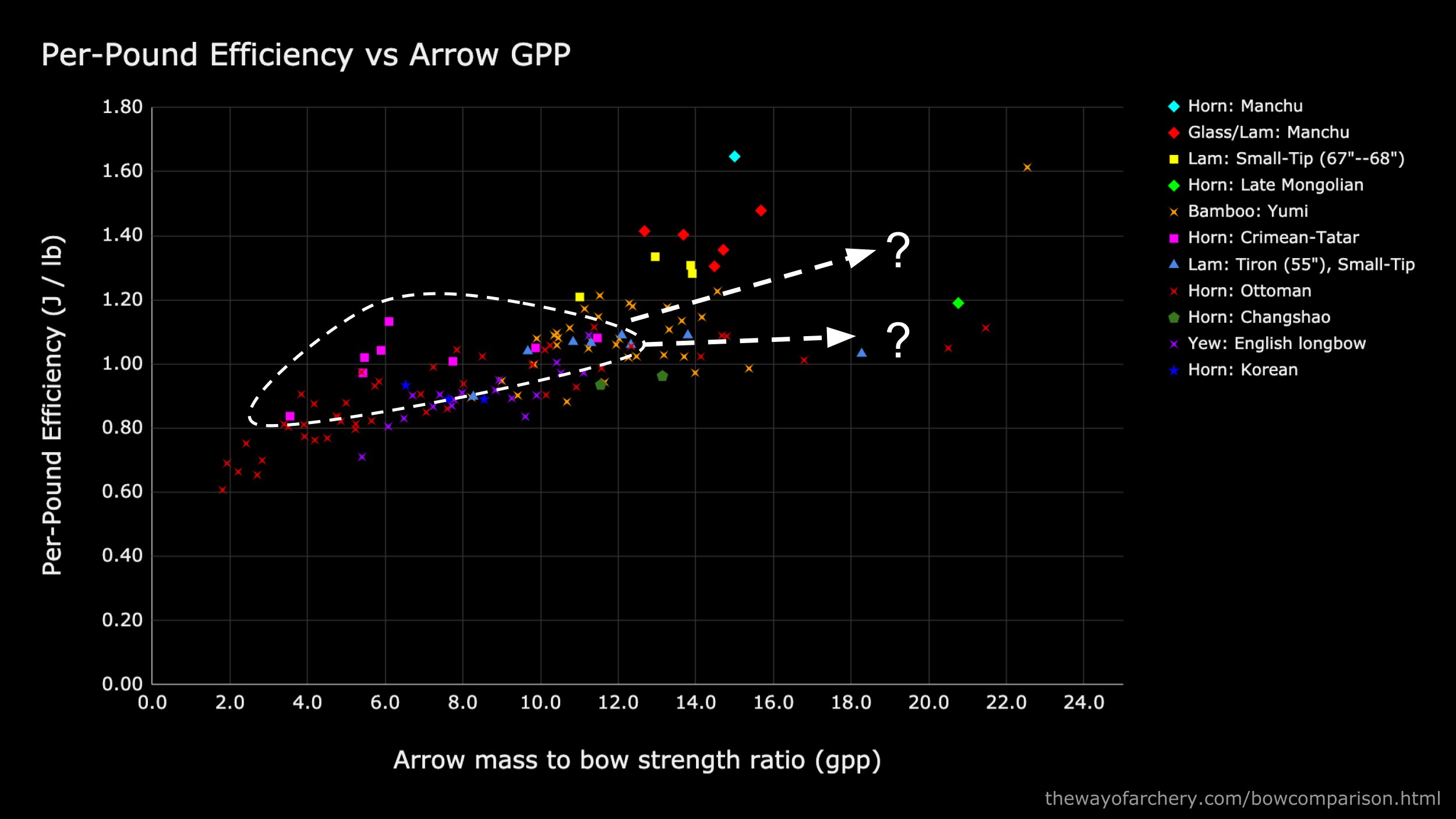 Crimean-Tatar horn bows, indicated with magenta squares, perform very well with arrows in the 4--12 gpp range. But what happens to the Crimean-Tatar’s performance at gpp’s of 12 to 18 and higher? Does efficiency plateau, or does it improve with heavier arrows?
