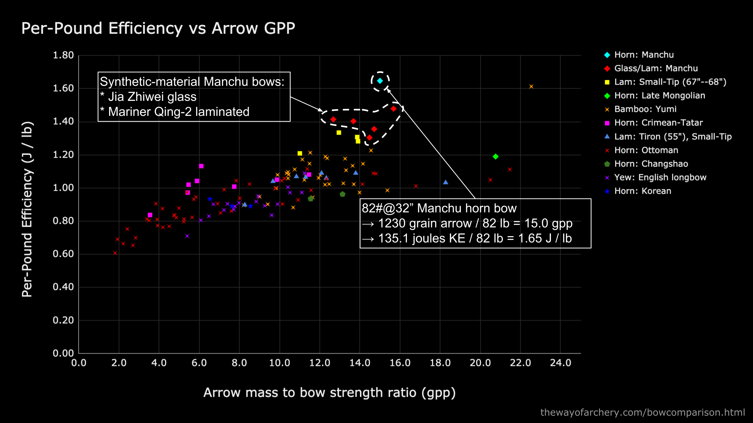 The Manchu bows made from synthetic constructions (such as the Jia Zhiwei glass bow or the Mariner Qing-2 laminated bow) are indicated in red diamonds. They have efficiencies of 1.3--1.5 Joules per pound. This suggests that data from the Manchu horn composite bow might not be too much of an outlier. Of course, I am just speculating here. We need more data to answer this question.