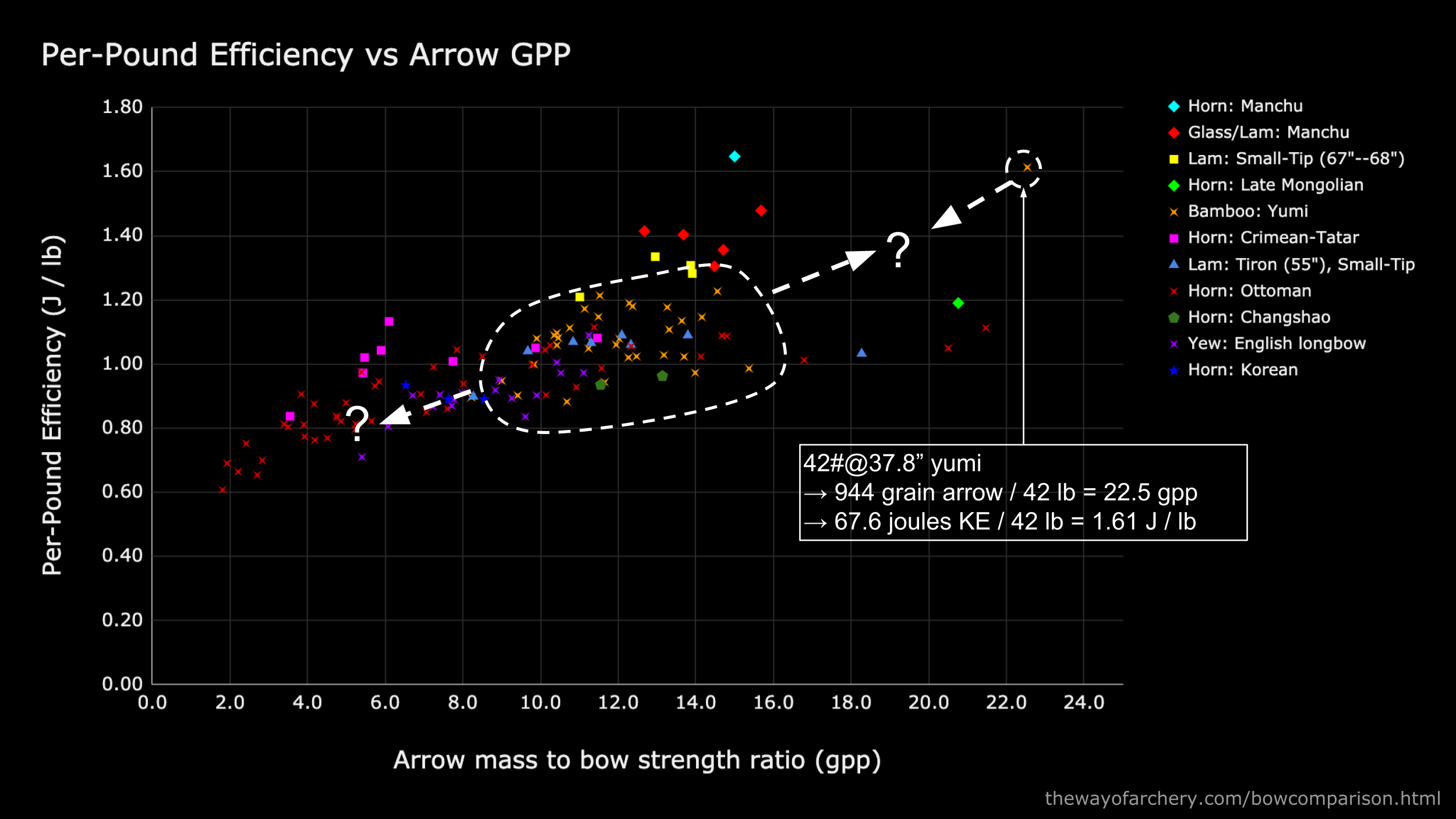 The Japanese yumi (indicated in orange x’s), on average, has very good efficiency in the 10--15 gpp range. The lone point at 22 gpp and efficiency 1.6 J/lb comes from a 42# yumi shooting a 940 grain arrow at 154 ft/s, or 67 joules of kinetic energy. Does this mean that yumis achieve peak efficiency at that arrow mass? Does this trend hold up for gpp’s in the 16--20 range? What happens to efficiency when yumis are shot with lighter arrows in the 4--8 gpp range?