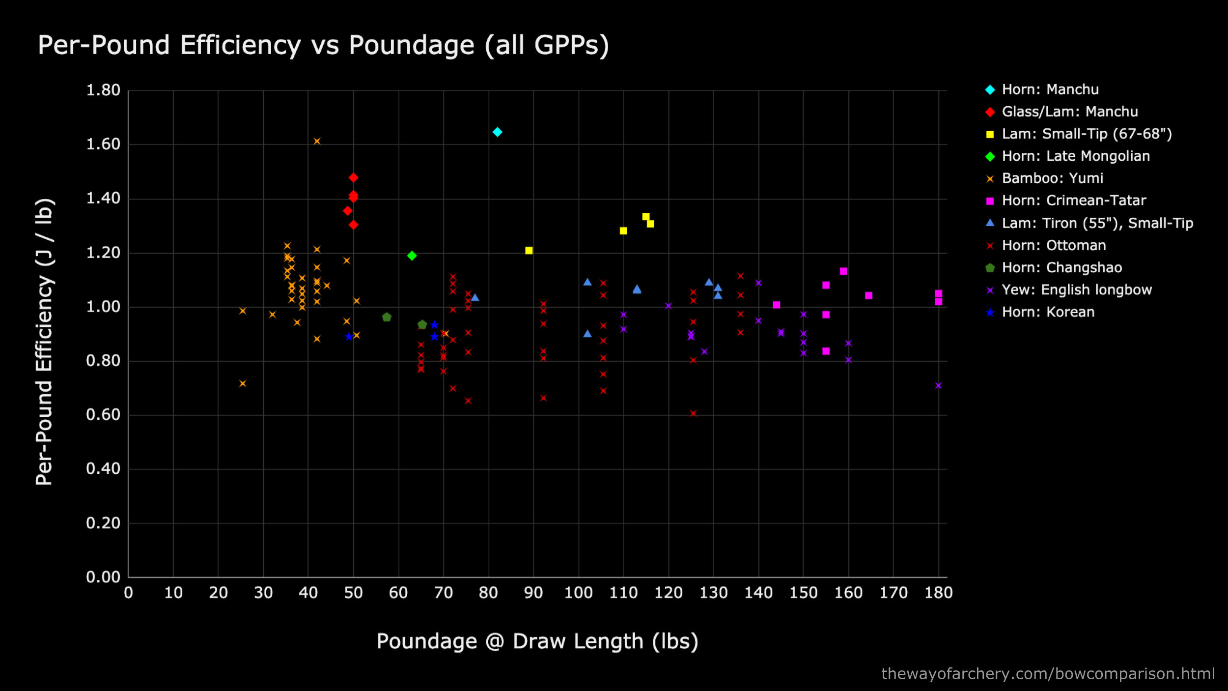 Finally we have the Manchu bow. The cyan diamond sitting atop the sea of points represents the lone Manchu horn bow measurement we have. At 15 gpp, it can achieve an efficient of 1.65 joules per pound. Data is scarce, but it provides a tantalizing glimpse into the Manchu horn bow’s power and potential. How would it do with lighter or heavier arrows?
