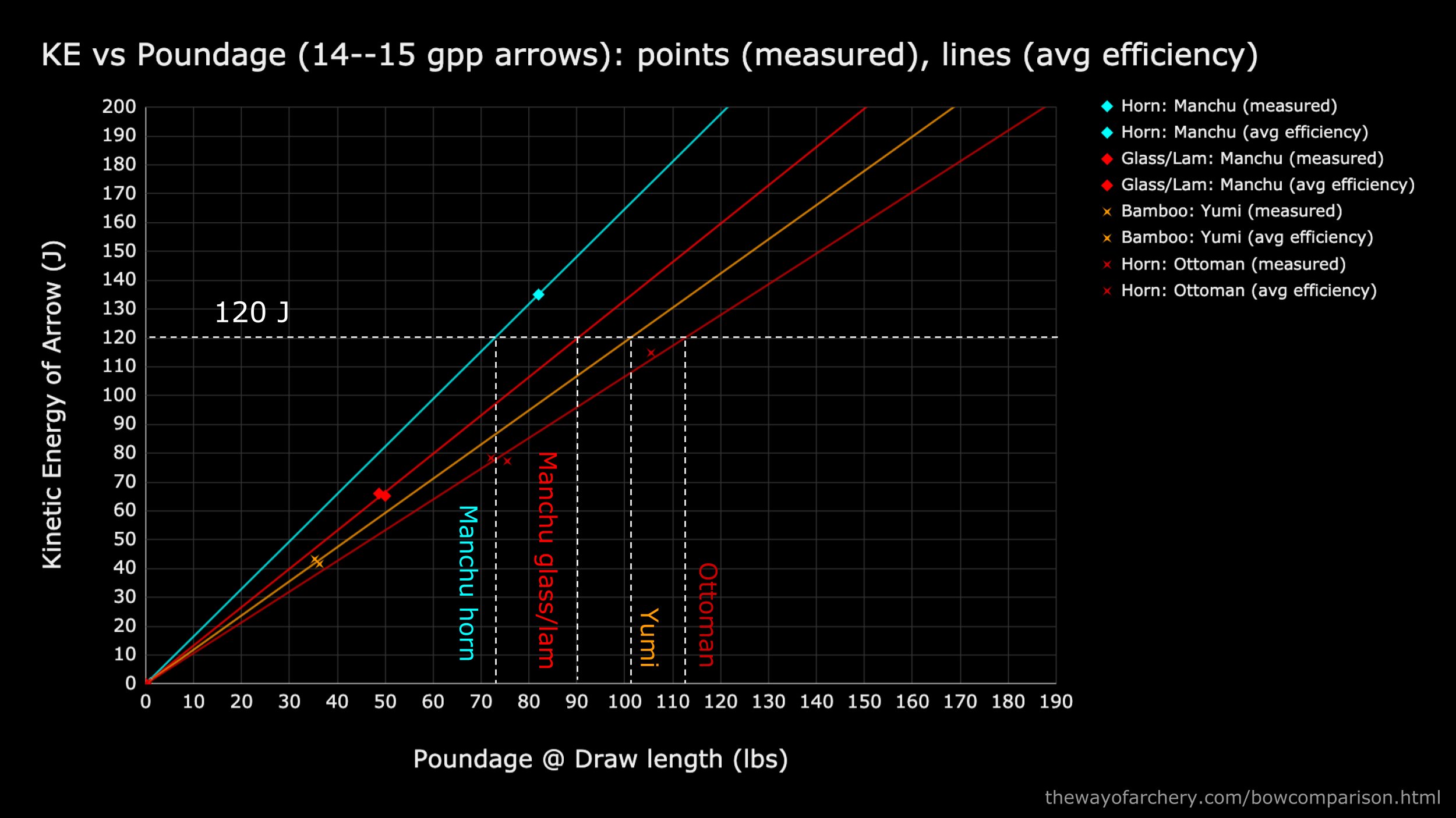 Now we can make rough estimates about what poundage bow we need to achieve particular kinetic energy goals. For example, to shoot an arrow with 120 joules of kinetic energy, we would roughly need a 72# Manchu horn bow, a 90# Manchu glass or laminated bow, a 102# bamboo yumi, or a 112# Ottoman horn bow.