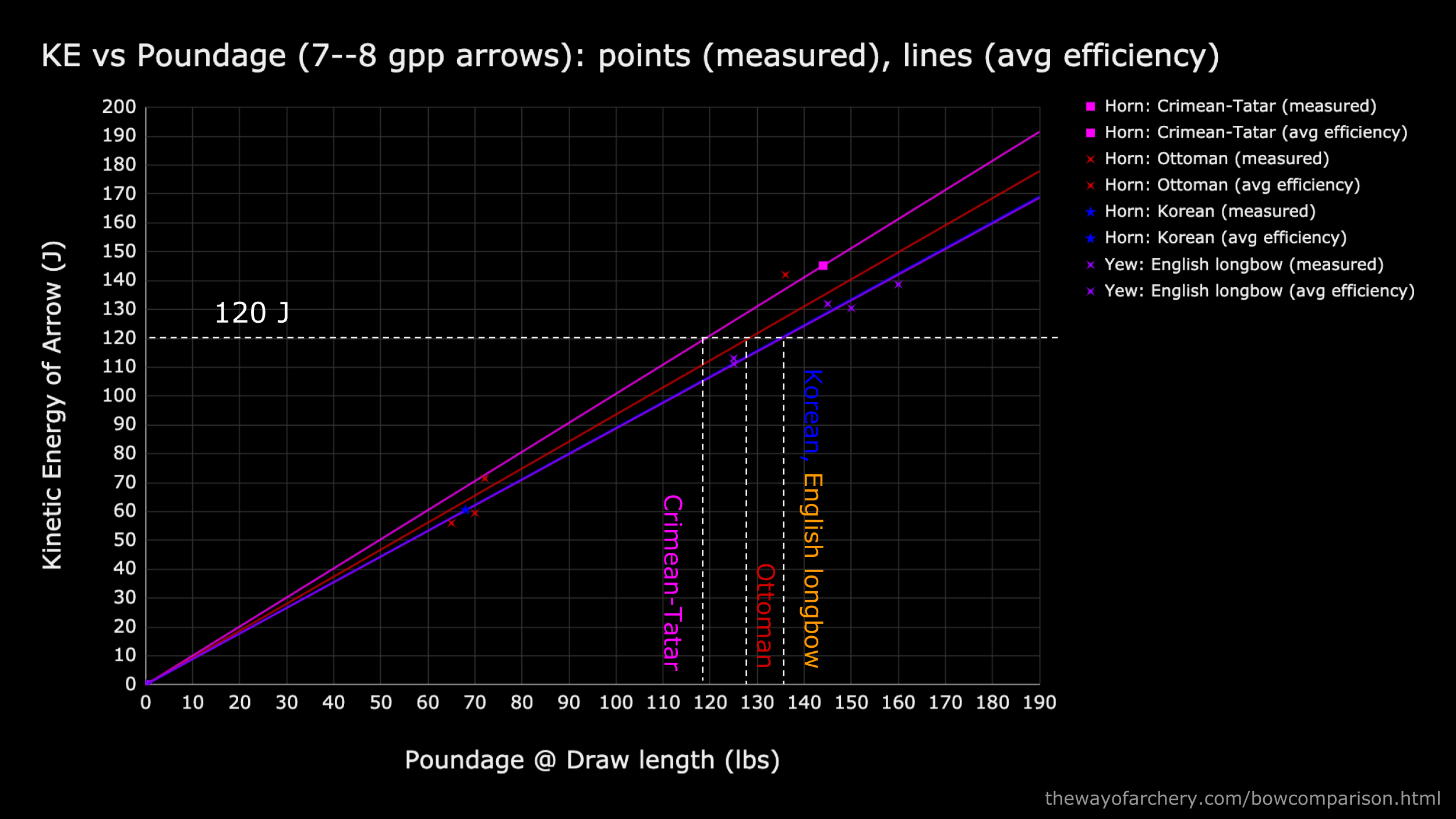 At 7--8 gpp, we can select these points for comparison. For these lighter arrows, to shoot an arrow with 120 joules, we would roughly need a 119# Crimean-Tatar horn bow, a 128# Ottoman horn bow, a 136# Korean horn bow, or 136# English longbow.